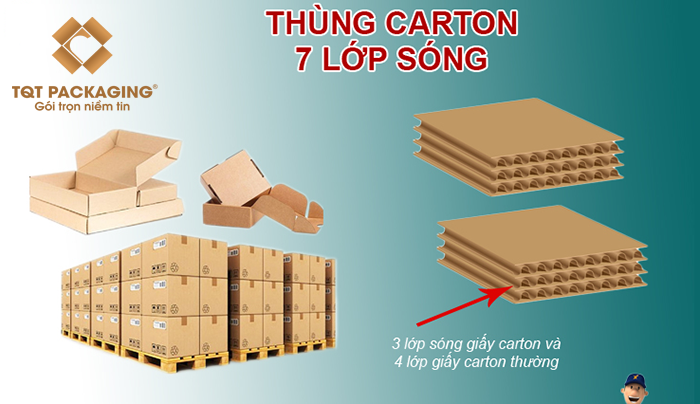 Loại giấy carton 7 lớp được cấu tạo tương tự như các loại giấy carton trước đó, chỉ khác là có tới 7 lớp, bao gồm hai lớp giấy phẳng bên ngoài, giấy mỏng kẹp giữa các lớp sóng ở giữa.