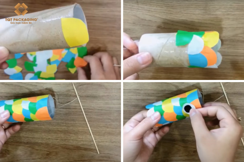 • Cắt giấy màu thành mẩu mỏng và dài. Dán chúng xung quanh phần thân để tạo đuôi.