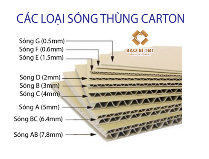 Để phục vụ cho những nhu cầu sản xuất khác nhau, hiện nay có 7 loại sóng giấy carton phổ biến. Mỗi loại sóng giấy có những thông số và đặc trưng khác nhau. Các loại sóng giấy này được phân biệt với nhau bằng các chữ cái in hoa như sau: