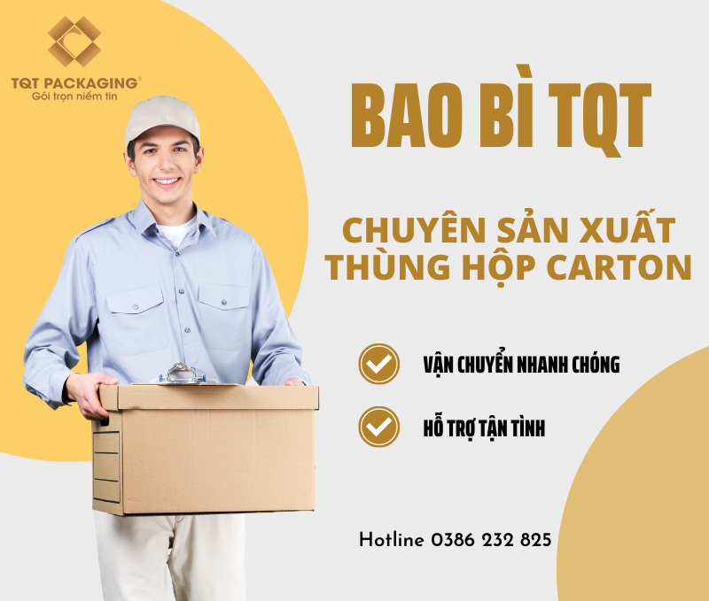 Chỉ cần để lại thông tin liên hệ hoặc liên hệ đến số Hotline: Đội ngũ nhân viên tại Bao Bì TQT luôn sẵn sàng hỗ trợ tư vấn, gia công sản xuất các mẫu thùng carton theo yêu cầu. Không chỉ giúp tăng tính thẩm mỹ, hiệu quả quảng bá thương hiệu cho hộp carton, chúng tôi còn tính toán kiểu dáng, tối ưu chi phí, kích thước cho khách hàng.