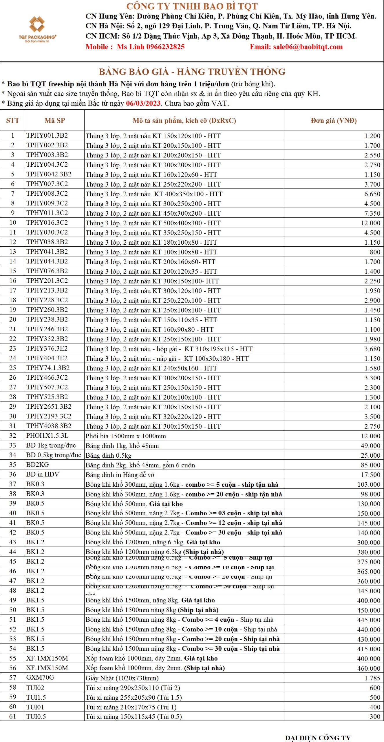 Bao Bì TQT xin gửi bảng giá thùng carton Hưng Yên mới nhất theo kích thước…